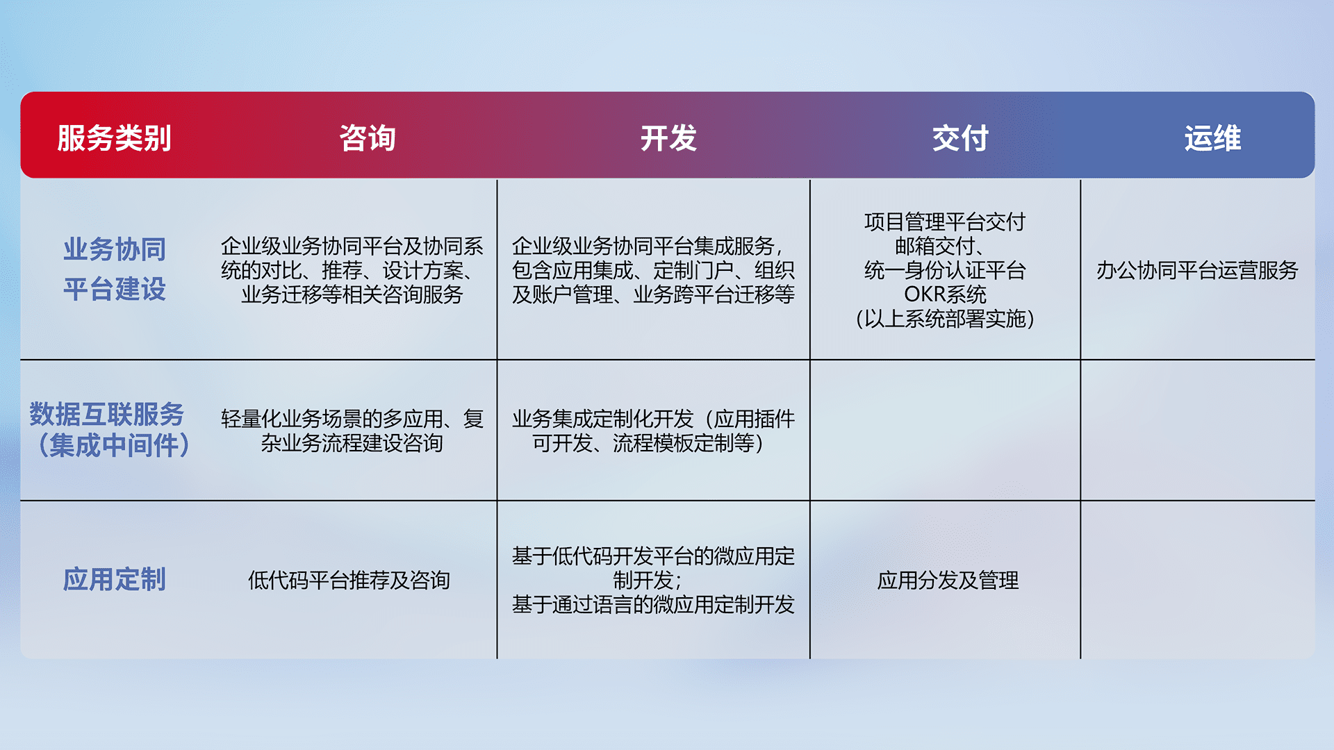 针对钉钉、、、、企微、、、、IDaas等平台级产品提供产品的规划、、、、方案、、交付、、、定制化开发等服务,,,,实现如统一协同办公、、、、智能客户服务、、混合会议管理、、、智能数据查询、、等业务场景,,,实现数字化转型。。。。