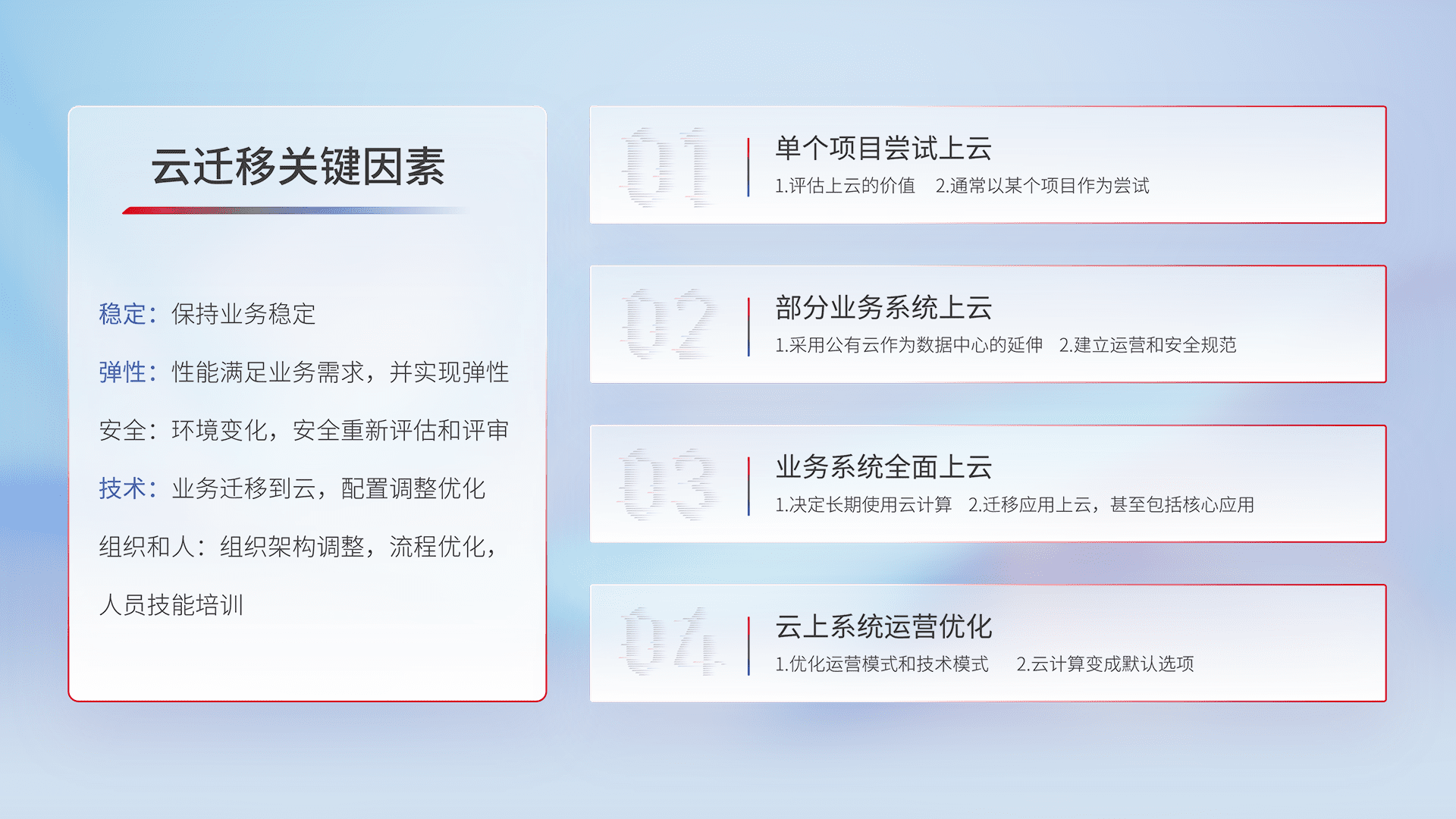 结合实际业务,,,,从规划设计、、、云平台选型、、云原生改造、、、数据迁移、、集成交付,,,,迁移全过程为客户识别最佳上云路径,,,做好风险识别管理,,,设计网络架构、、身份权限、、安全审计合规、、操作审计、、、、日志审计、、、监控告警策略、、、多站点容灾设计等,,,,对云上基础设施进行整体规划,,提升IT治理水平,,以满足弹性、、、高可用、、高性能的需求。。。。