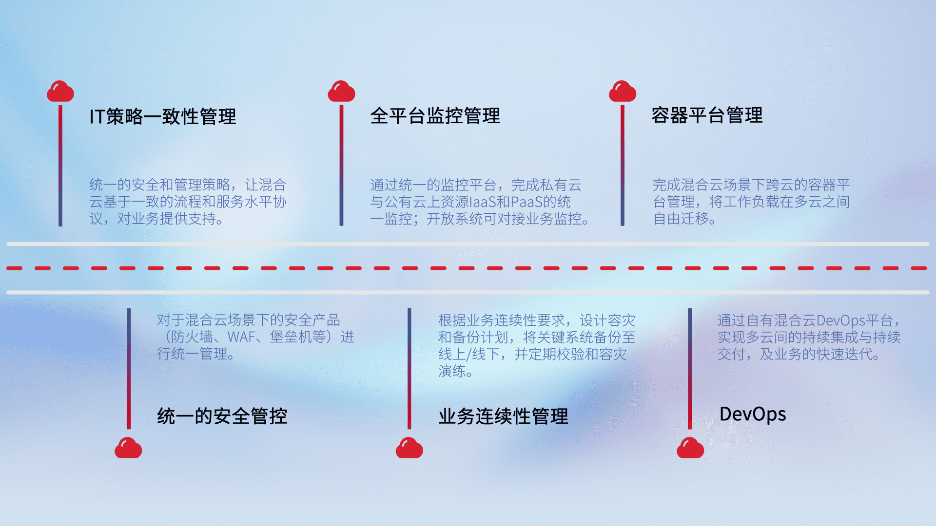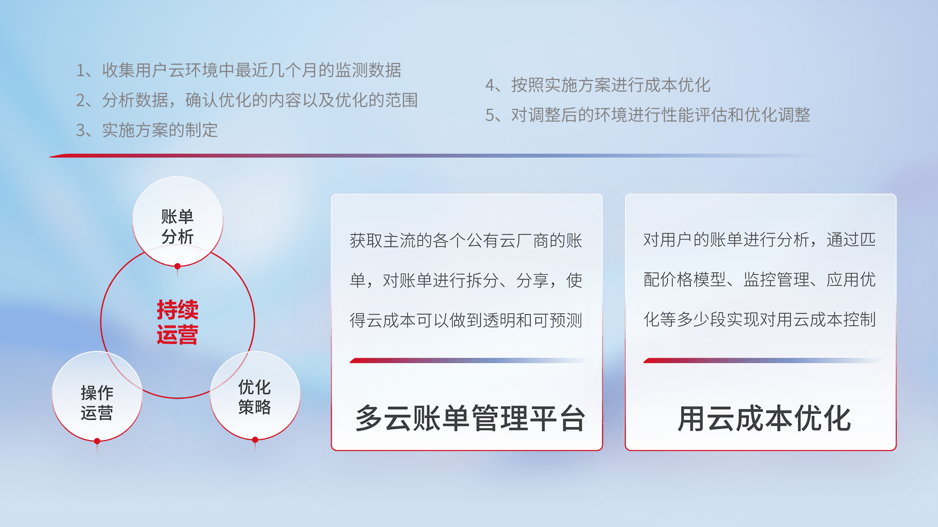 通过多云纳管,,,以统一的资源数据模型把客户的云资源进行抽象和封装,,进而实现对多云资源的统一操作,,保障云资源管理的可靠性、、稳定性与可用性。。量身定制化运维内容,,,配置、、、、开发运维、、补丁管理、、、、备份、、监控、、认证和访问管理、、审计和日常巡检等,,,,保障在用云过程中的可靠度,,,,稳定度以及高可用率。。