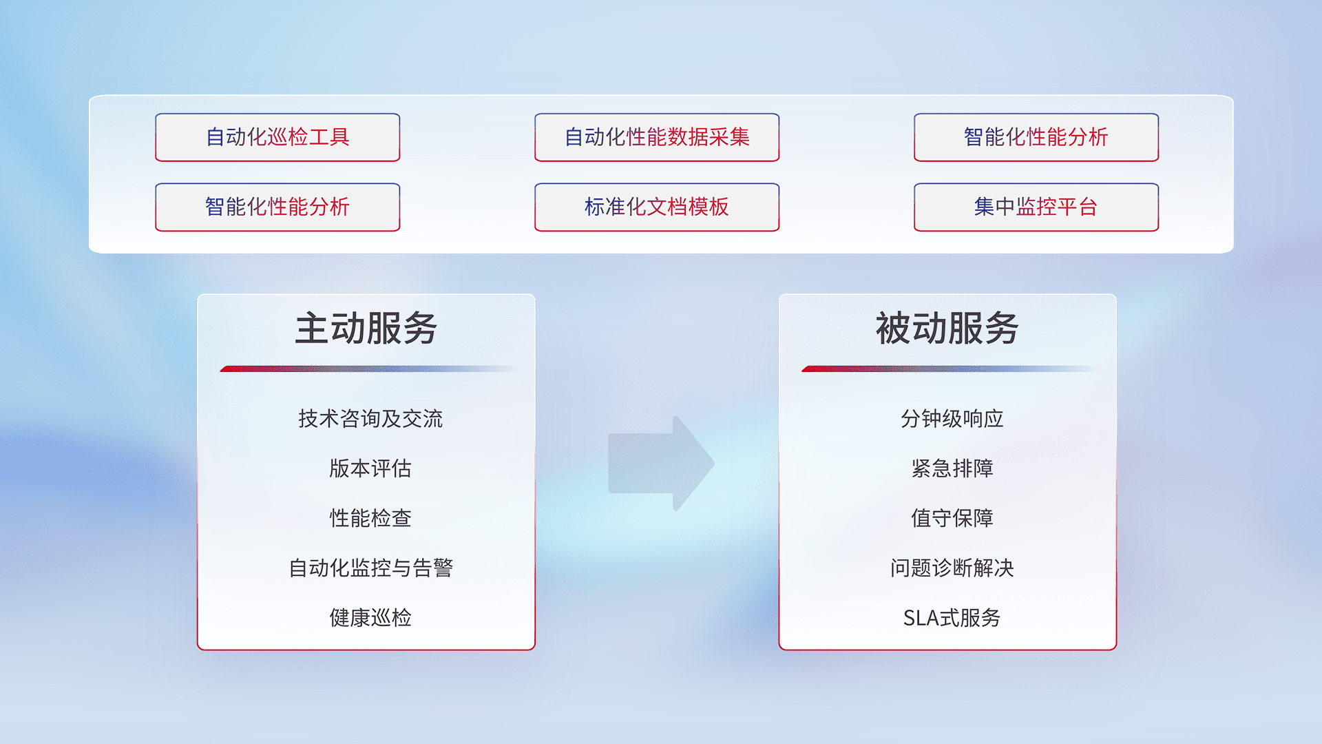智能化工具和标准化文档,,,保障服务质量,,,,提供主动服务(包含技术咨询、、版本评估、、、性能检查、、、、自动化监控与告警、、、、健康巡检)和被动服务包含(分钟级响应、、、紧急排障、、、、值守保障、、、、问题诊断解决、、、SLA服务)。。。。